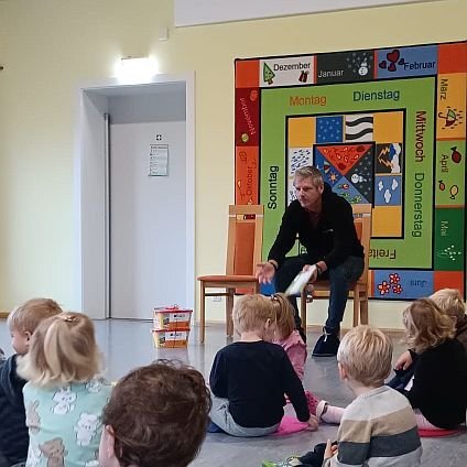 Eine Woche später, am 17. Oktober 2025, war auch Kreishandwerksmeister Marco Kemnitzer in der Kindertagesstätte „Große Au“ in Gattendorf zu Gast. Mit derselben Geschichte rund um Geckoloni und die Kinder Mia, Till und Kim begeisterte er die Kinder, die gespannt den Abenteuern rund um den Rohrbruch im Tulpenweg 3 lauschten – und dabei erfuhren, wie wichtig Fachkräfte für unsere Gesellschaft sind.